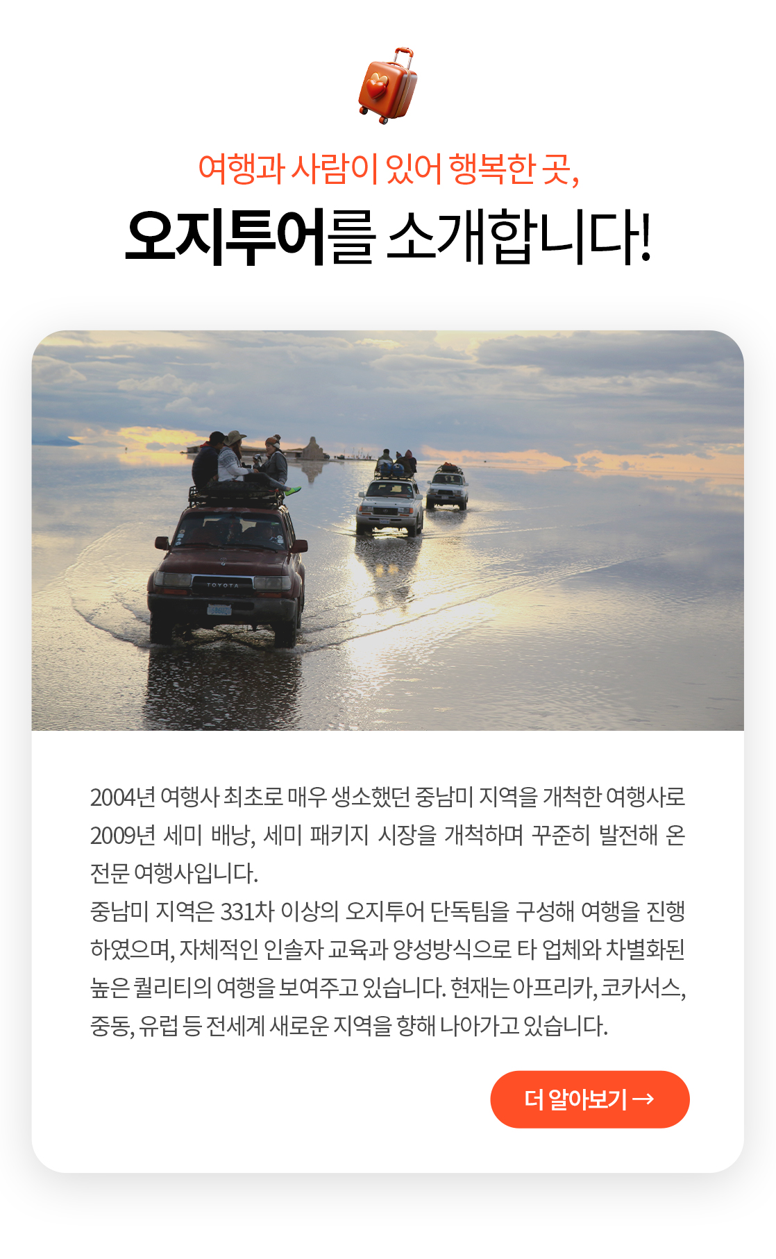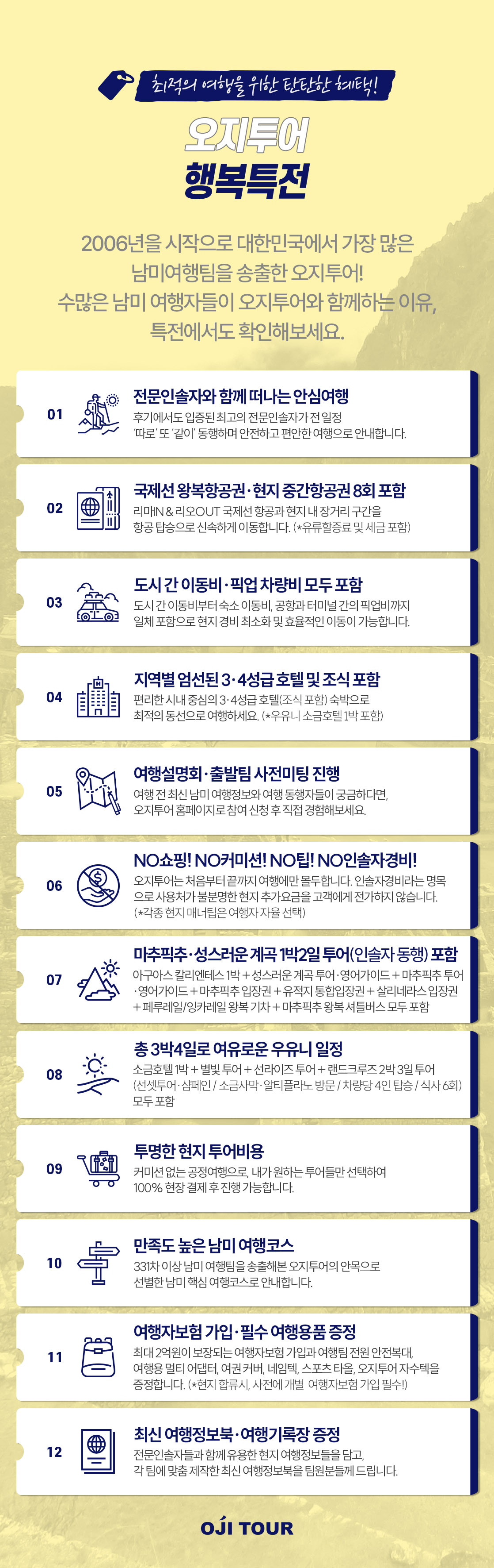 ◆ 천재지변, 파업 등의 현지 사정으로 인한 일정 변경 및 추가 요금은 (주)오지투어가 책임지지 않습니다.