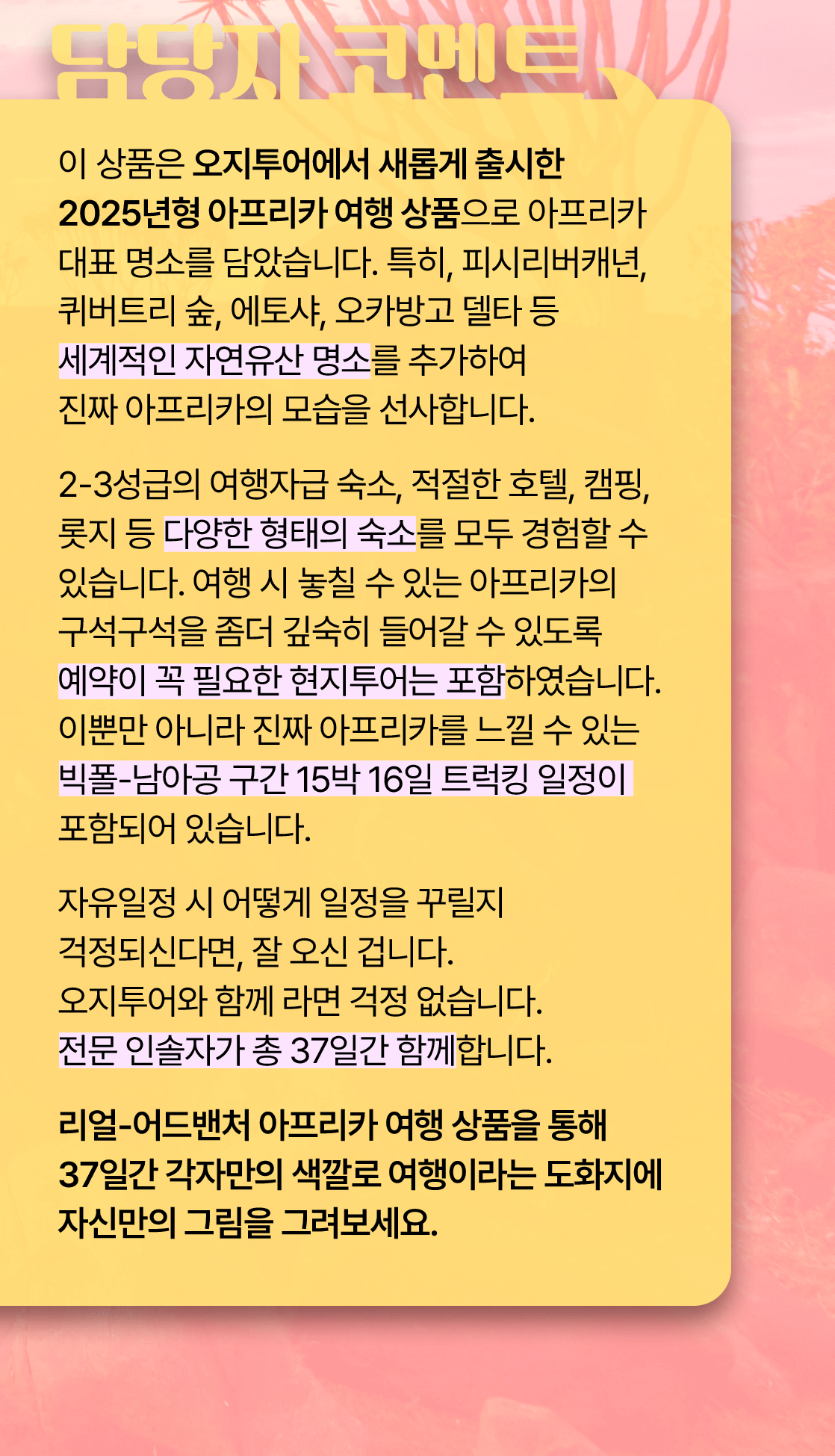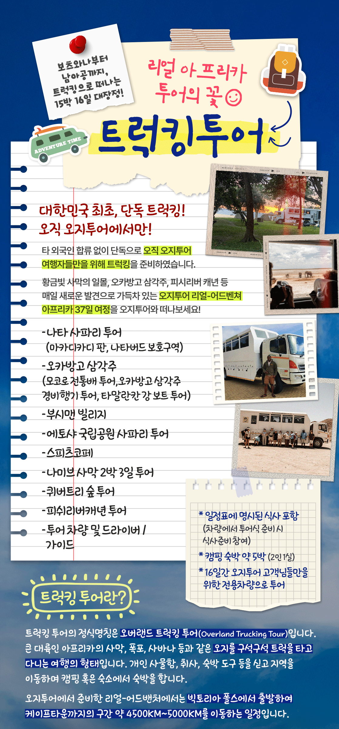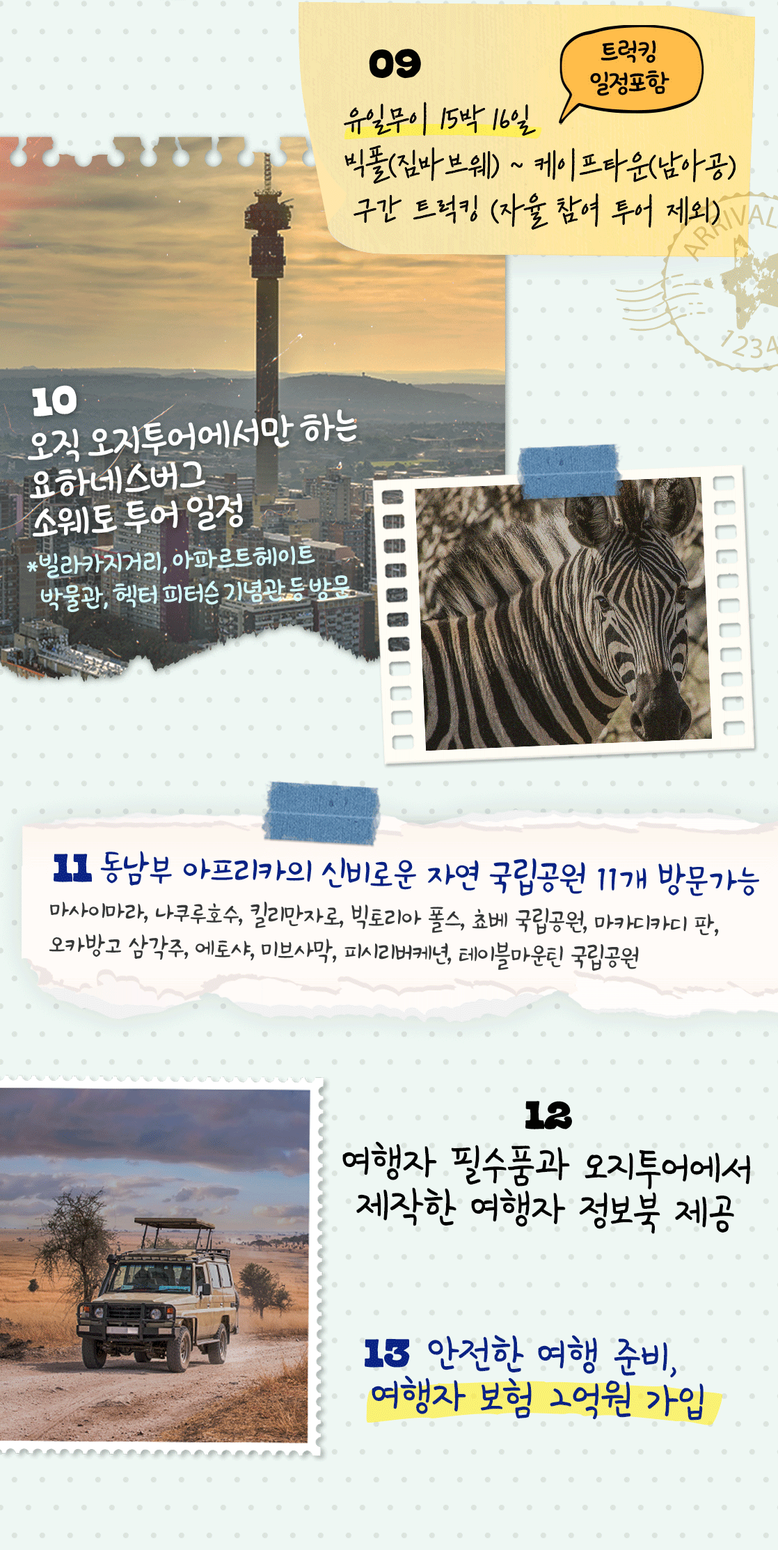 - 본 여행은 이미 확보된 항공 좌석을 판매하는 것이 아니라, 실시간으로 항공 좌석 조회 후 예약과 발권이 진행되는 변동성 상품으로, 여행자의 예약 시점에 따라 실제 여행 요금은 ㈜오지투어 홈페이지에 명기된 여행 요금과 차이가 있을 수 있습니다.